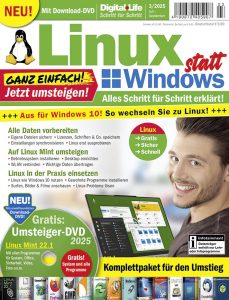 Die Lösung: Wechseln Sie auf Linux! Mit der neuen Digital Life gelingt Ihnen der Umstieg, denn sie begleitet Sie mit klaren Schritt-für-Schritt-Anleitungen. So fällt es Ihnen leicht, PC und Daten auf den Wechsel vorzubereiten, Linux zu installieren und genauso bequem wie Windows einzurichten. Die Download-DVD bietet alles, was Sie für den Umstieg brauchen – mit Mint 22.1 sogar das ideale System. Es ähnelt Windows in der Bedienung, wird lange mit Updates versorgt und bringt alle wichtigen Programme kostenlos mit.